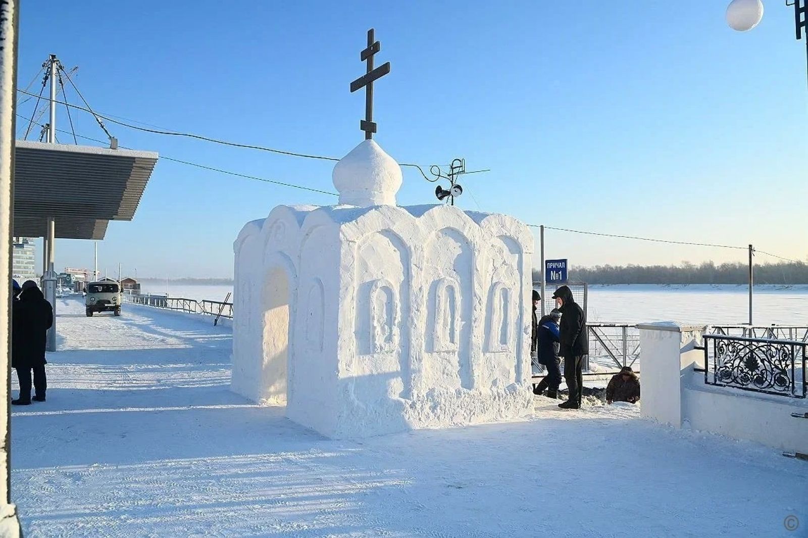 19 января площадка будет полностью готова. Сейчас работы уже на финальной стадии. В течение недели специалисты смонтировали временное дополнительное освещение, обустроены снежная часовня, мостки для удобного прохода к воде. Сейчас на площадке ведутся работы по обустройству купели для омовения и ледяного креста. Ближе к празднику поставят специальные надувные палатки для переодевания и обогрева.
