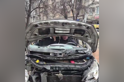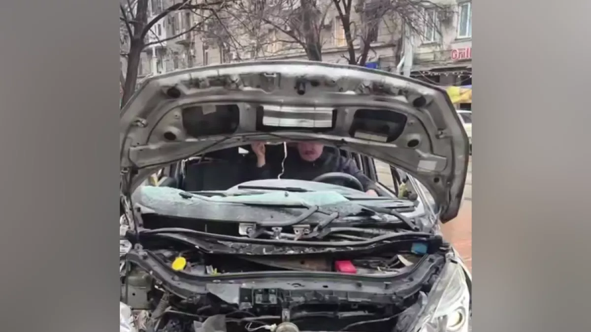 У автомобиля после прилета оказалась повреждена передняя часть. При этом двигатель машины удалось завести, и она даже поехала