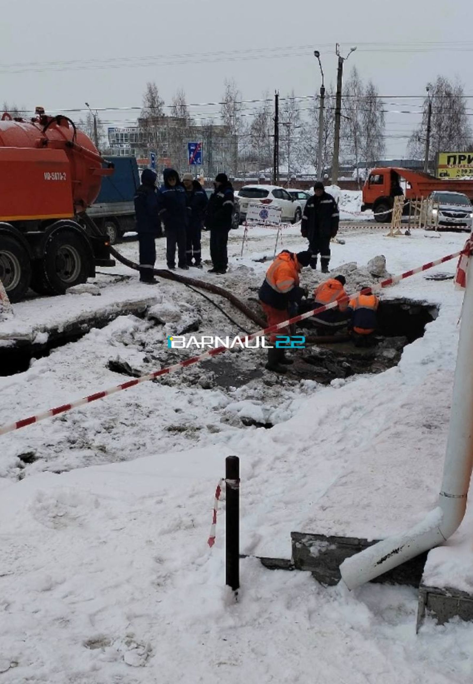 В "Росводоканал Барнаул" рассказали, что провал образовался из-за повреждения на водопроводе диаметром 200 мм. Специалисты засыпали и огородили яму, провели чистку камеры.