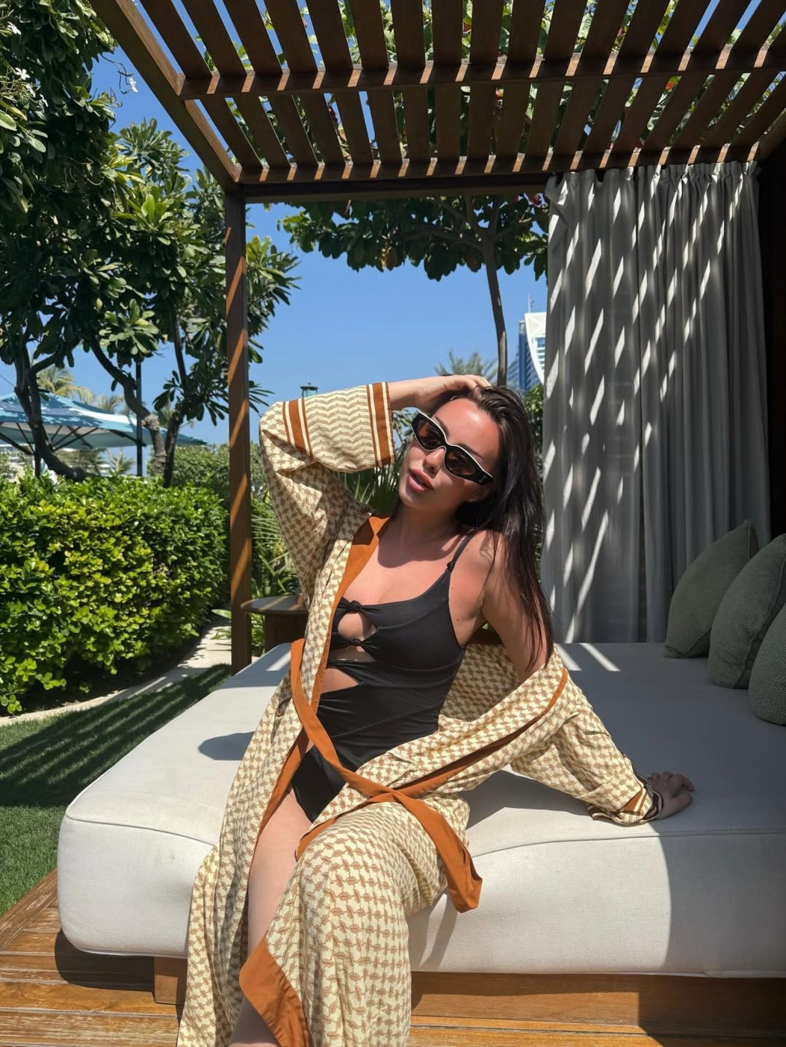 Таисия Маслякова опубликовала в личном блоге серию снимков, сделанных во время поездки в Дубай. На фотографиях 19-летняя девушка позирует на фоне курортных локаций в черном купальнике. Образ она дополнила легкой накидкой и солнцезащитными очками бренда Chanel.