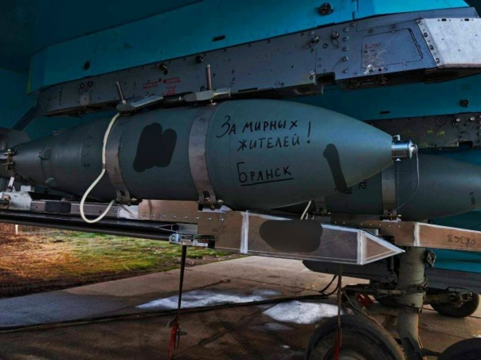 Кроме того, по данным автора блога, российские бойцы сделали надписи "За каждого нашего – 1000 ваших" и "За мирных жителей! Брянск". Уточняется, что использовались фугасные авиабомбы ФАБ-500.