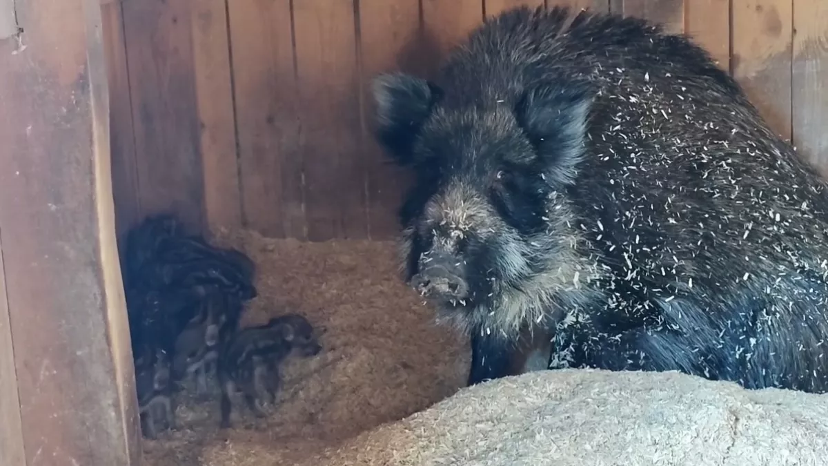 У молодых кабанов Нюры и Кеши родились полосатые поросята. Родители заботливо охраняют малышей и не подпускают посторонних