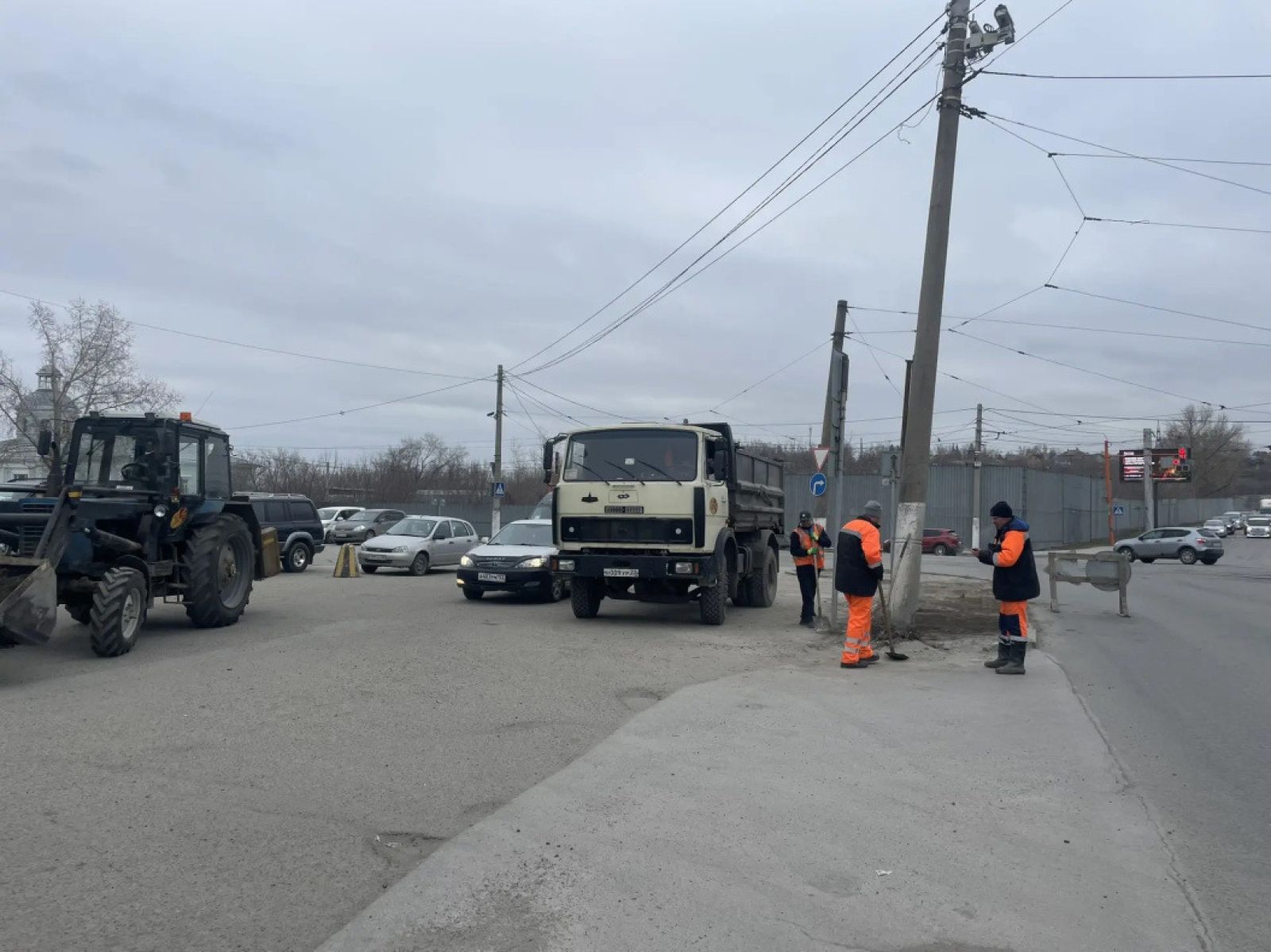 Рабочие очищают прибордюрную зону от грунтового наноса, собирают и вывозят мусор, прометают тротуары от грязи и пыли.