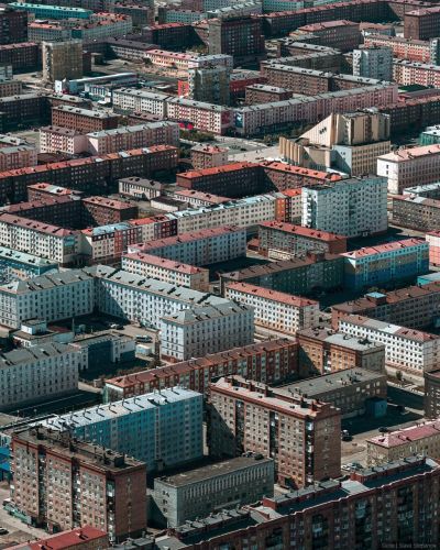 Фотограф Слава Степанов запечатлел Норильск с высоты, показав его строгую архитектуру и практически полное отсутствие зеленых насаждений. На серии аэрофотоснимков город предстает без привычной зелени, с четко выстроенными кварталами и плотной застройкой. Кадры опубликованы в telegram-канале фотографа.