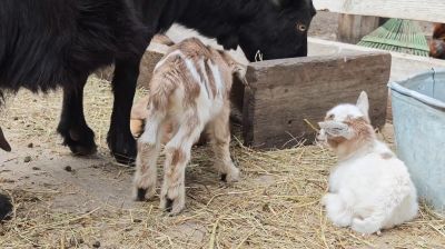 "Еще одна жена Жорика стала мамой — и сразу на три козлёнка пополнила нашу большую и дружную семью! Смотрим видео и замечаем: малыши пока поменьше своих старших братьев и сестер. Это вполне нормально: при многоплодной беременности козлята нередко рождаются чуть мельче", – объяснили в "Лесной сказке".