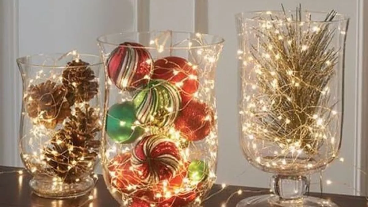 Старую, но работающую гирлянду, а также мишуру, шарики, еловые ветки, шишки можно собрать и положить в прозрачную вазу, аквариум или симпатичную банку. Включаем в розетку гирлянду и наслаждаемся красотой.