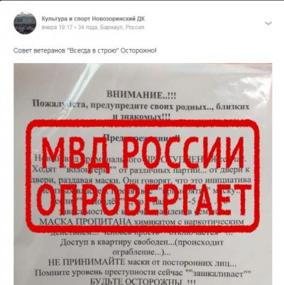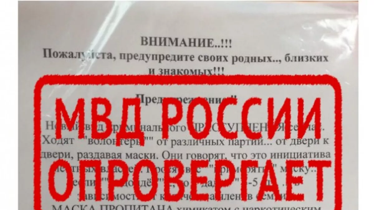 В соцсетях распространяются сообщения о том, что «волонтеры от различных партий» предлагают жителям Алтайского края примерить маски, пропитанные наркотическим веществом, а после грабят их квартиры. Однако эта информация не соответствует действительности, сообщили в пресс-службе регионального МВД.