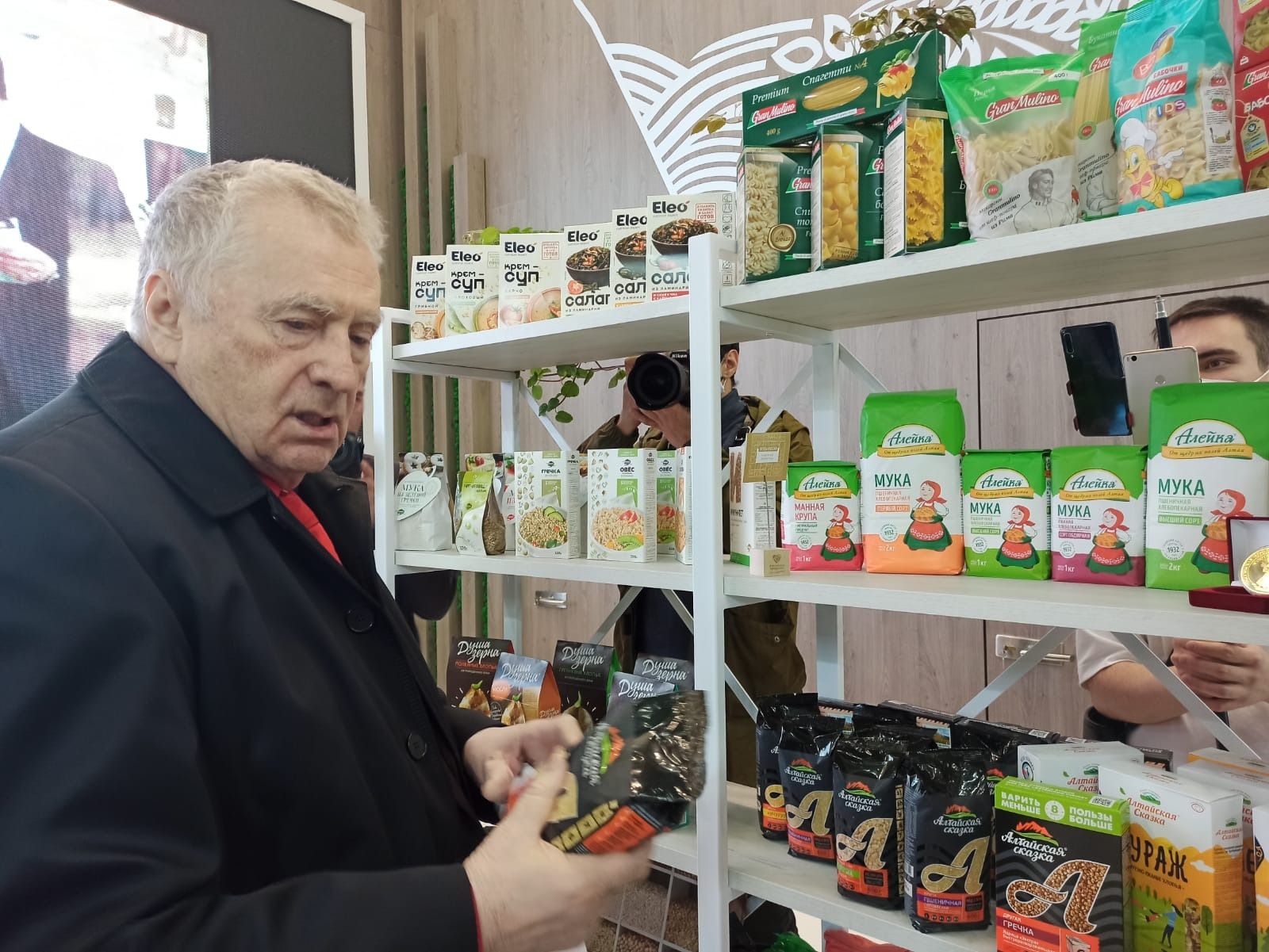 Жириновский высоко оценил ассортимент и качество продукции из Алтайского края, похвалив ее за натуральность и пользу для здоровья. Лидер ЛДПР попробовал алтайский сыр, льняную и медовую халву, а также медовый пряник. Кроме того, он купил несколько алтайских товаров, а именно масло-спрей, облепиховое масло, бальзам, макароны, гречневую крупу, сыры, геркулесовые и гречневые хлопья и минеральную лечебно-столовую воду.