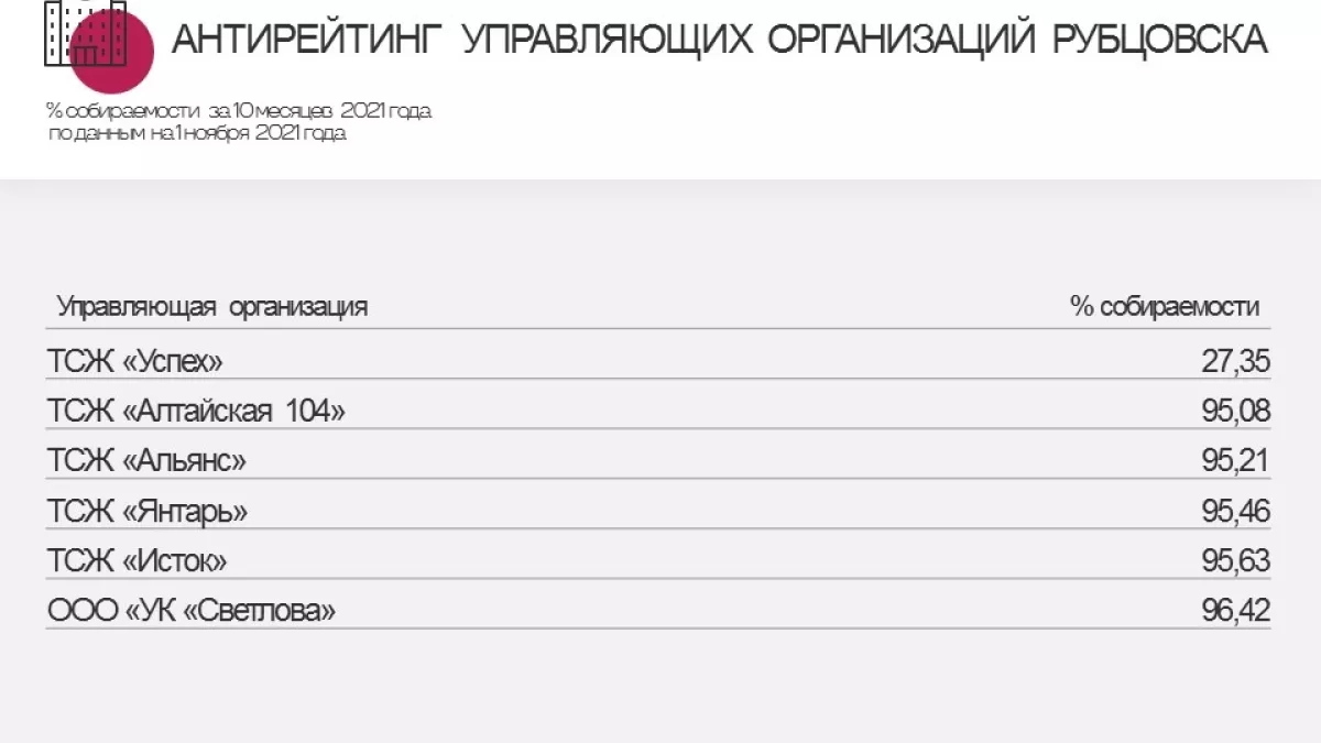 В антирейтинг попало шесть рубцовских компаний, в их управлении совокупно находится 106 домов. И во главе снова ТСЖ «Успех». За четыре дома товарищество должно СГК более 29 млн рублей. А собираемость здесь всего 27,3%.