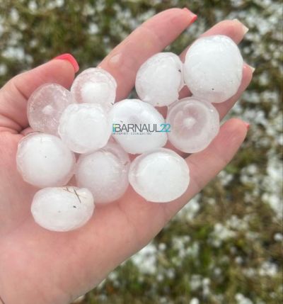 Вечером 5 июля в селе Алтайское выпал крупный град. Его диаметр сопоставим с грецким орехом. Кадры очевидцы публикуют в соцсетях.