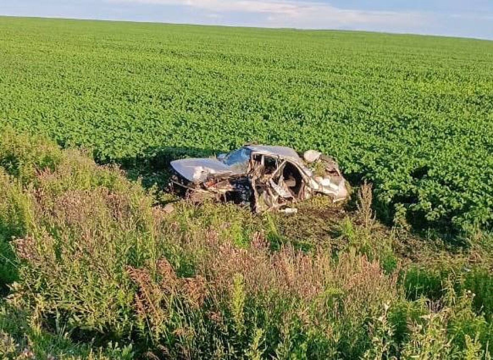 После сильного удара один из автомобилей оказался в кювете.