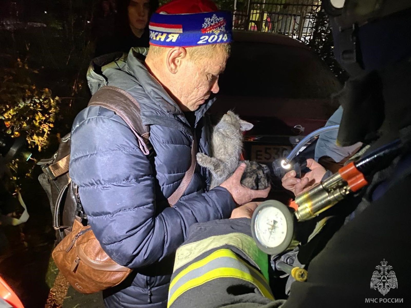 Возгорание оперативно ликвидировали 13 пожарных, привлекались три автоцистерны и автолестница. Звенья газодымозащитной службы по лестницам спасли шесть человек, эвакуированы 15 человек. На фото видно, что один из пожарных с кислородным баллоном помогает котам, которых держит на руках мужчина.