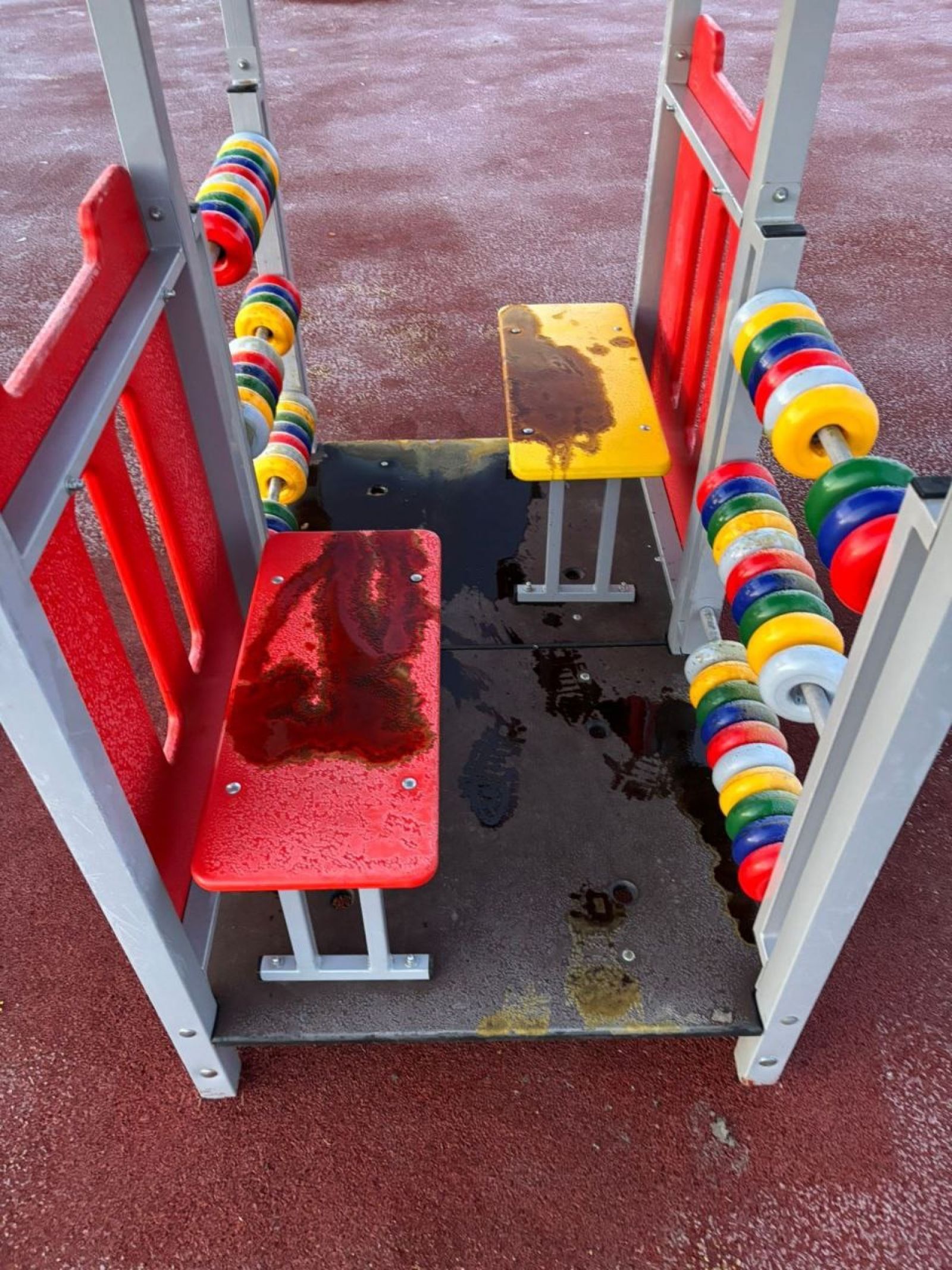 "Малые архитектурные формы (детские горки, качели, скамьи, плитка) облиты автомобильным маслом", – говорится в посте.