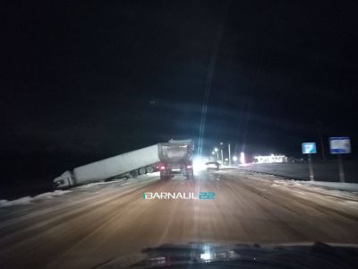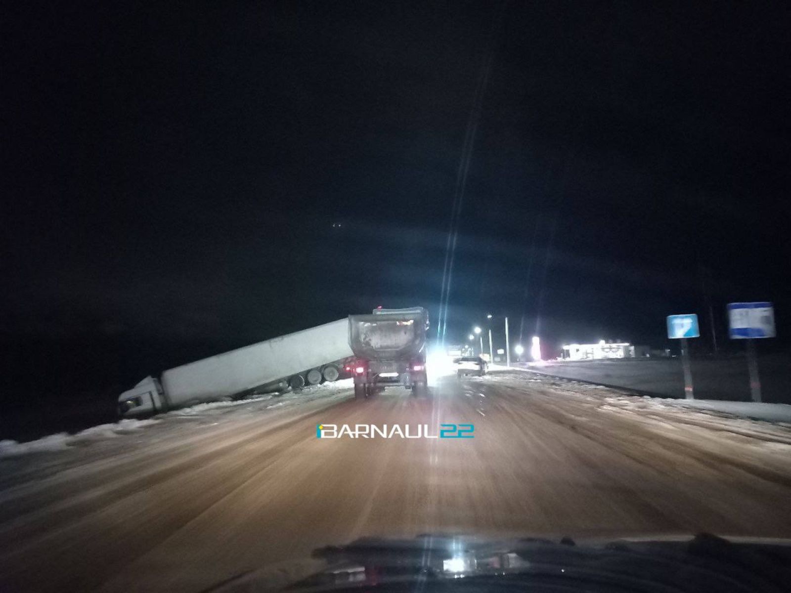 Фура съехала в кювет на трассе в Троицком районе Алтайского края. Кадры с места происшествия опубликовал telegram-канал Barnaul 22.