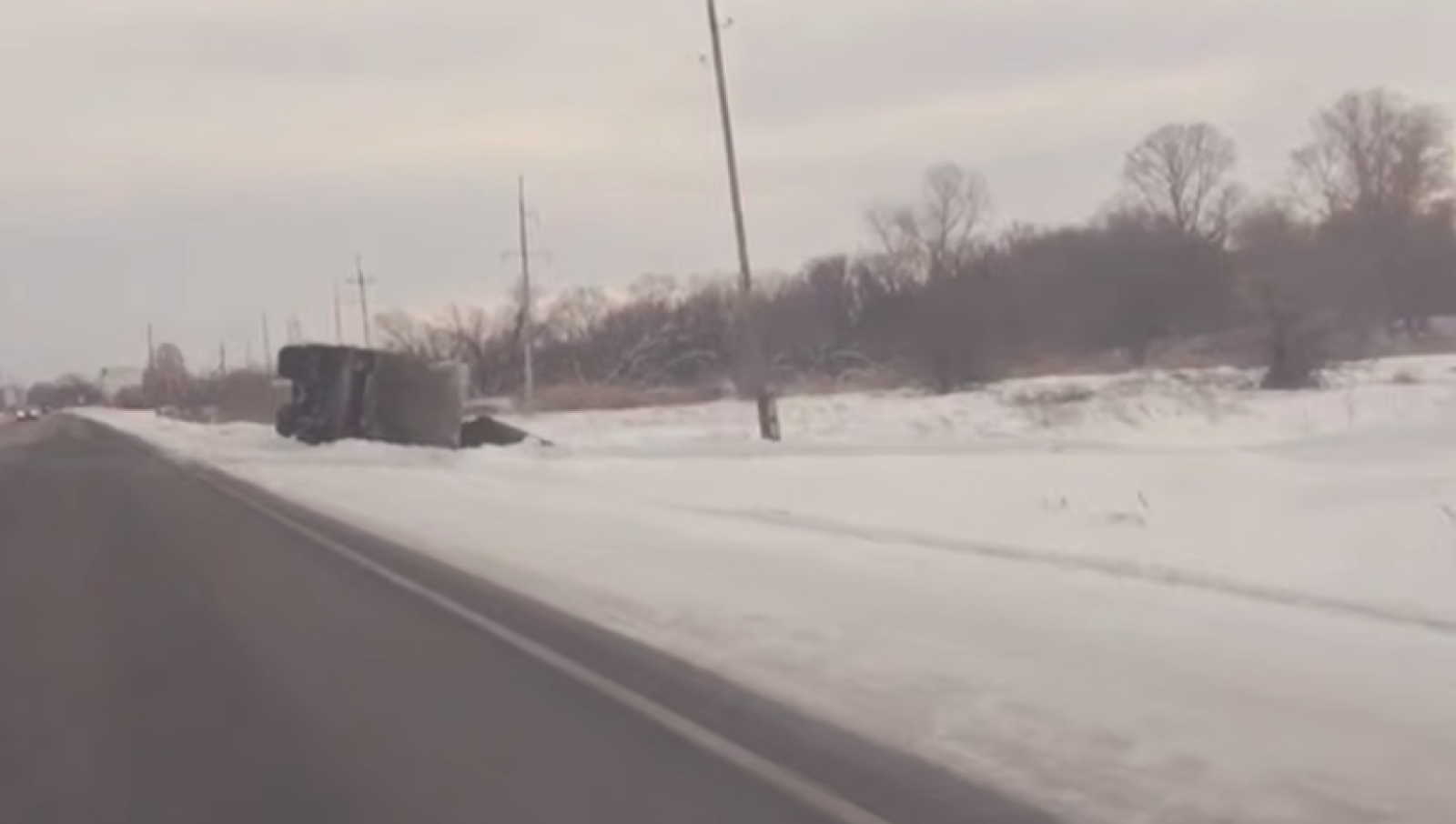 Авария произошла утром в четверг, 25 декабря. Очевидцы запечатлели завалившийся на бок прицеп, из которого высыпалось содержимое. Тягача рядом не видно.