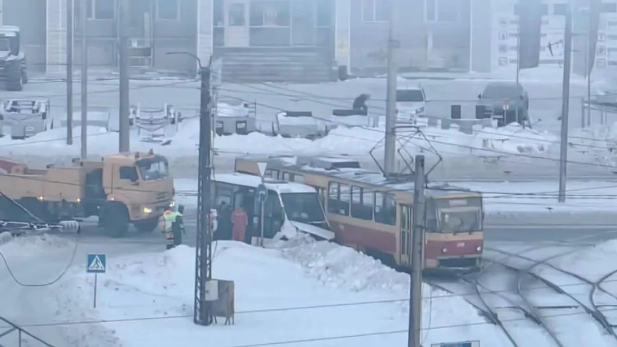 Авария произошла на повороте. На кадре видно, что машина "прильнула" к борту трамвая — у маршрутки повреждена передняя часть. Рядом можно заметить людей.