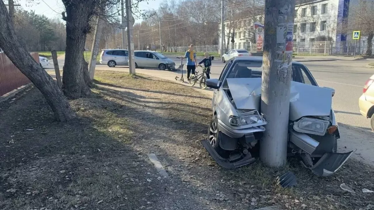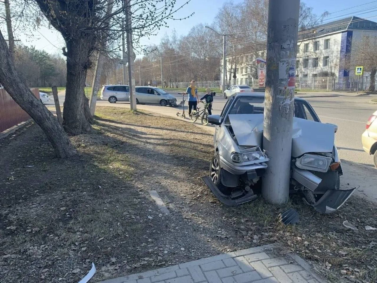 Сам момент ДТП автор фото не застал. На фото лишь последствия: легковой автомобиль взял на таран столб на повороте. Пострадал ли кто-то — неизвестно.
