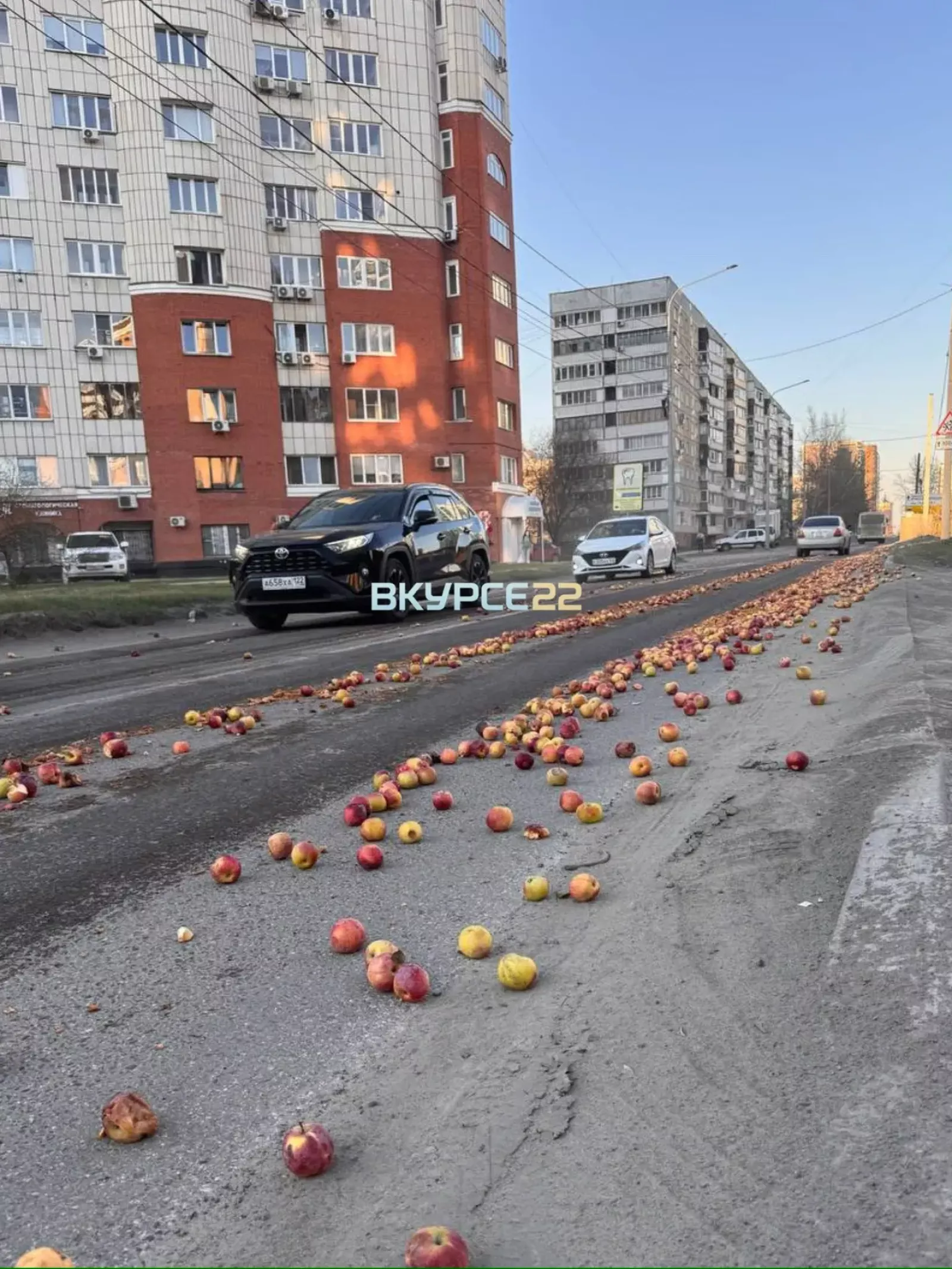 В Барнауле на ул. Партизанской из грузовика высыпались яблоки. По словам прохожих, аромат там теперь потрясающий, пишет telegram-канал "В курсе 22".
