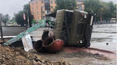 В Барнауле грузовик-манипулятор упал в вырытую на месте ремонтных работ яму. Об этом сообщают очевидцы в паблике "Барнаул 22" во "ВКонтакте".