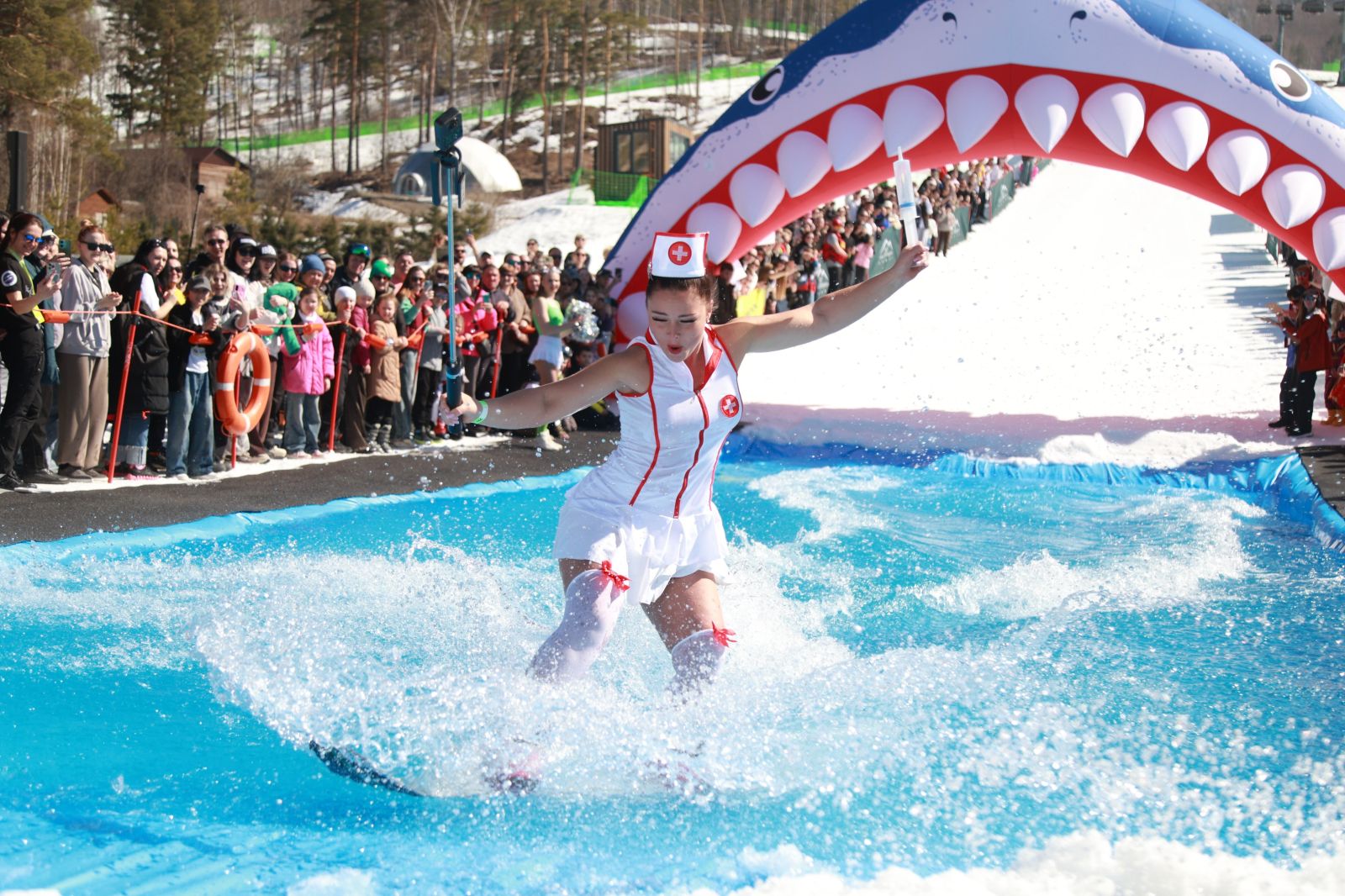 Так, на склоне можно было увидеть горячую медсестру, чирлидерш, сотрудницу полиции с наручниками, фею, зайчика и леопарда. Также по бассейну проплывали представители различных профессий – пожарные и сварщики, морские обитатели – акула и медуза, герои популярных мультфильмов – Человек-паук, Салли и другие. Особенно эпатажные костюмы и "мокрые" финиши зрители встречали бурными овациями.