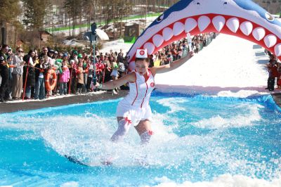 Фестиваль "Прыжок в лето" отгремел 3 и 4 апреля. Самым зрелищным моментом закрытия горнолыжного сезона стал спуск с горы в бассейн. Участники разгонялись на лыжах и сноубордах, чтобы либо эффектно проскользить по водной глади и сохранить сухими свои наряды, либо выполнить зрелищный прыжок в воду. Интересно, что с каждым годом фантазия конкурсантов становится все более впечатляющей.