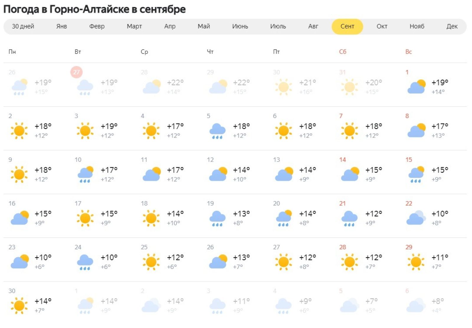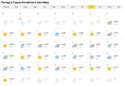 По информации "Гисметео", в первом месяце осени в Горно-Алтайске должно быть много осадков. По прогнозу сервиса, дожди будут идти 1-3, 5-6, 9-12 и 14 сентября, а затем еще десять дней подряд – с 19 по 28 сентября. Предположительно, холоднее всего будет 2 сентября, когда ночная температура может достигнуть +7 градусов, а дневная +12 градусов. Самым теплым днем может стать 4 сентября, когда воздух прогреется до +21 градуса.