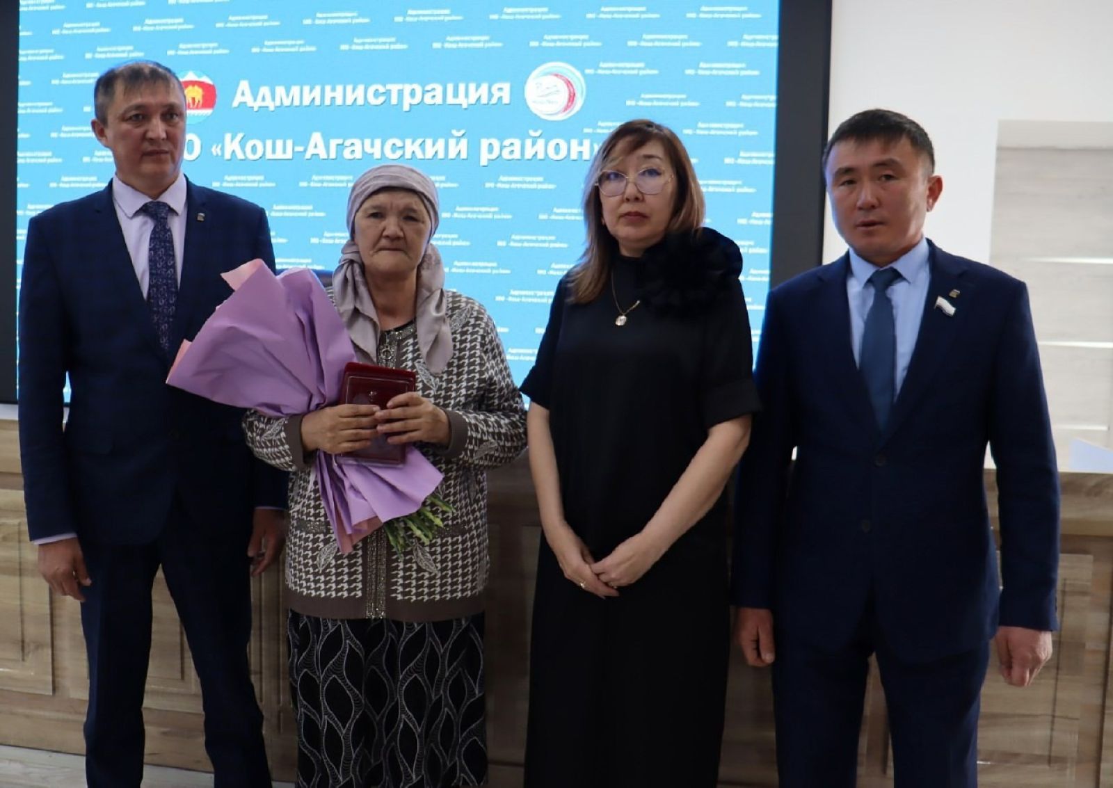 Старший сержант гвардии Кельжан Алпейсов родился в селе Кош-Агач. Он погиб в возрасте 35 лет в районе Сладкого, отдав жизнь за Родину и товарищей. Награду приняла его мать Жупар Алпейсова.