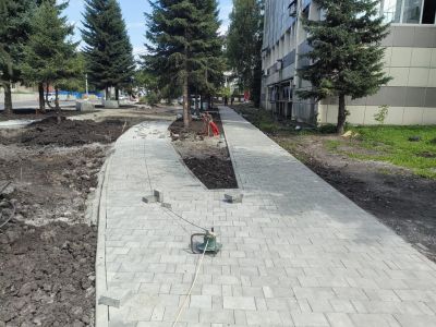 На данный момент специалисты готовят основания под тротуары, устанавливают бордюрный камень и поребрик, а также укладывают брусчатку на площадках и тротуарах.
