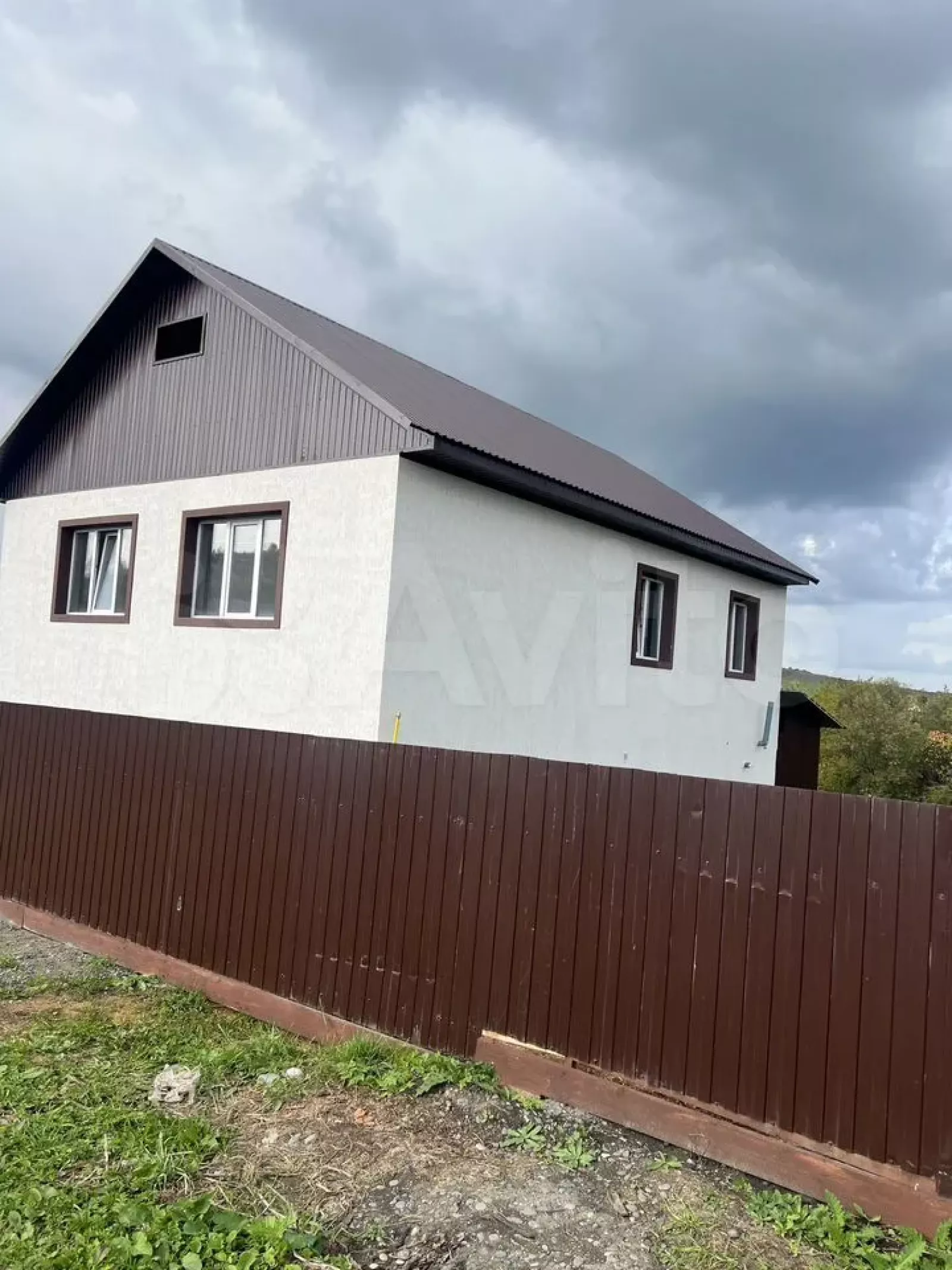 В доме выполнена отделка ламинатом, фасад покрыт декоративной штукатуркой "короед". На участке площадью девять соток расположена баня.