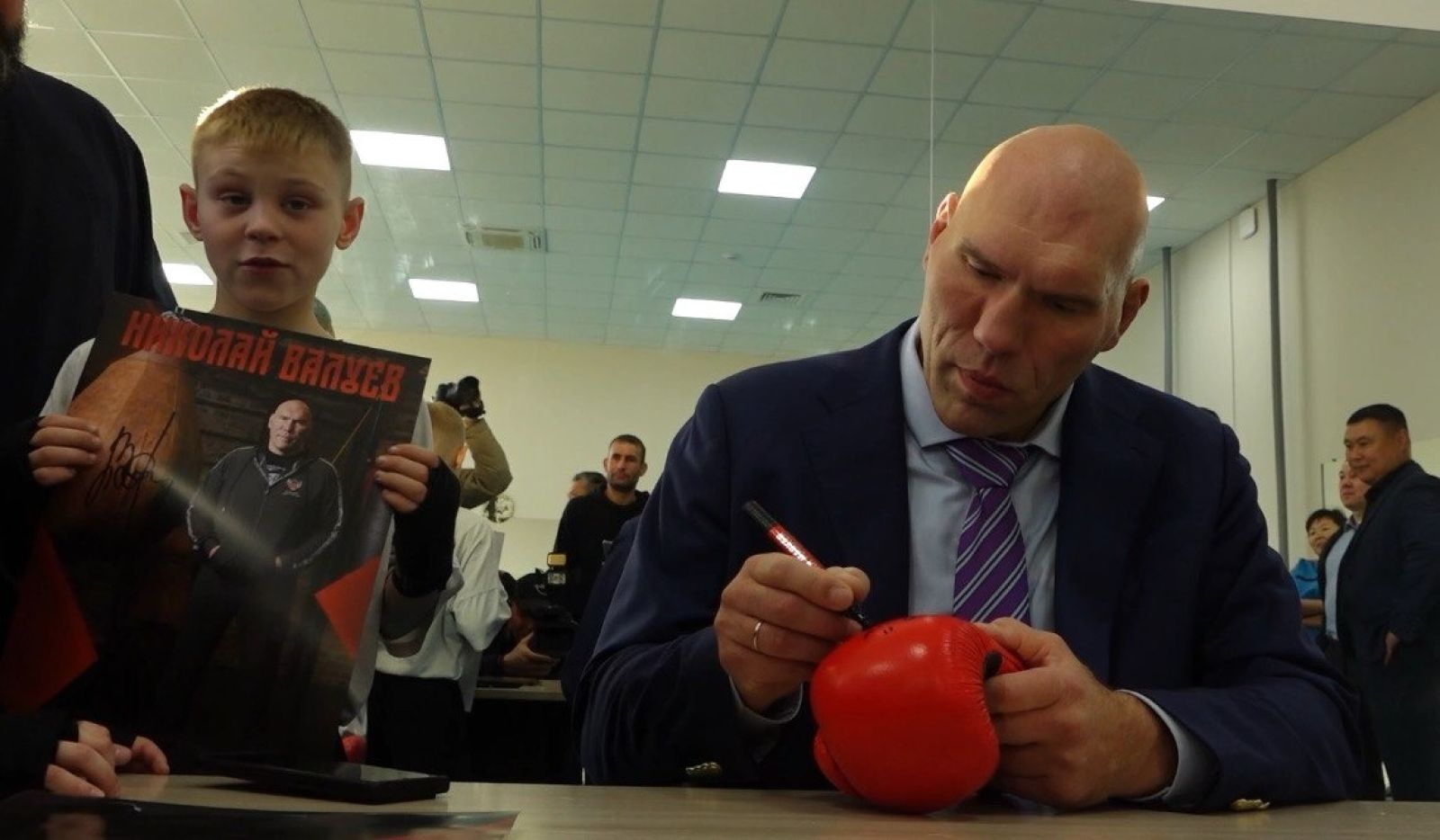 Спортшкольники только обживаются в новом зале. Чтобы этот процесс шел быстрее, именитый боец подарил юниорам боксерские груши и перчатки. Также Николай Валуев раздал автографы и дал несколько напутствий начинающим спортсменам.