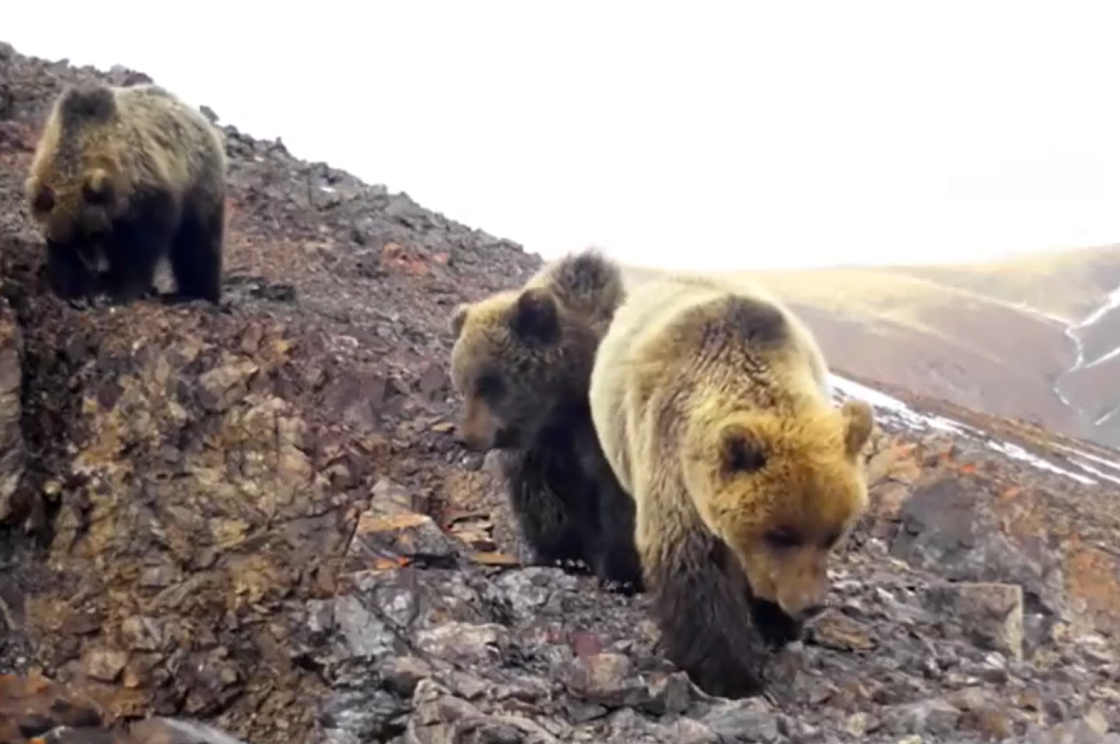 Местные косолапые отличаются от других своих сородичей более светлым окрасом и белыми когтями. На видео хищники бродят по каменистым склонам в поисках пищи.