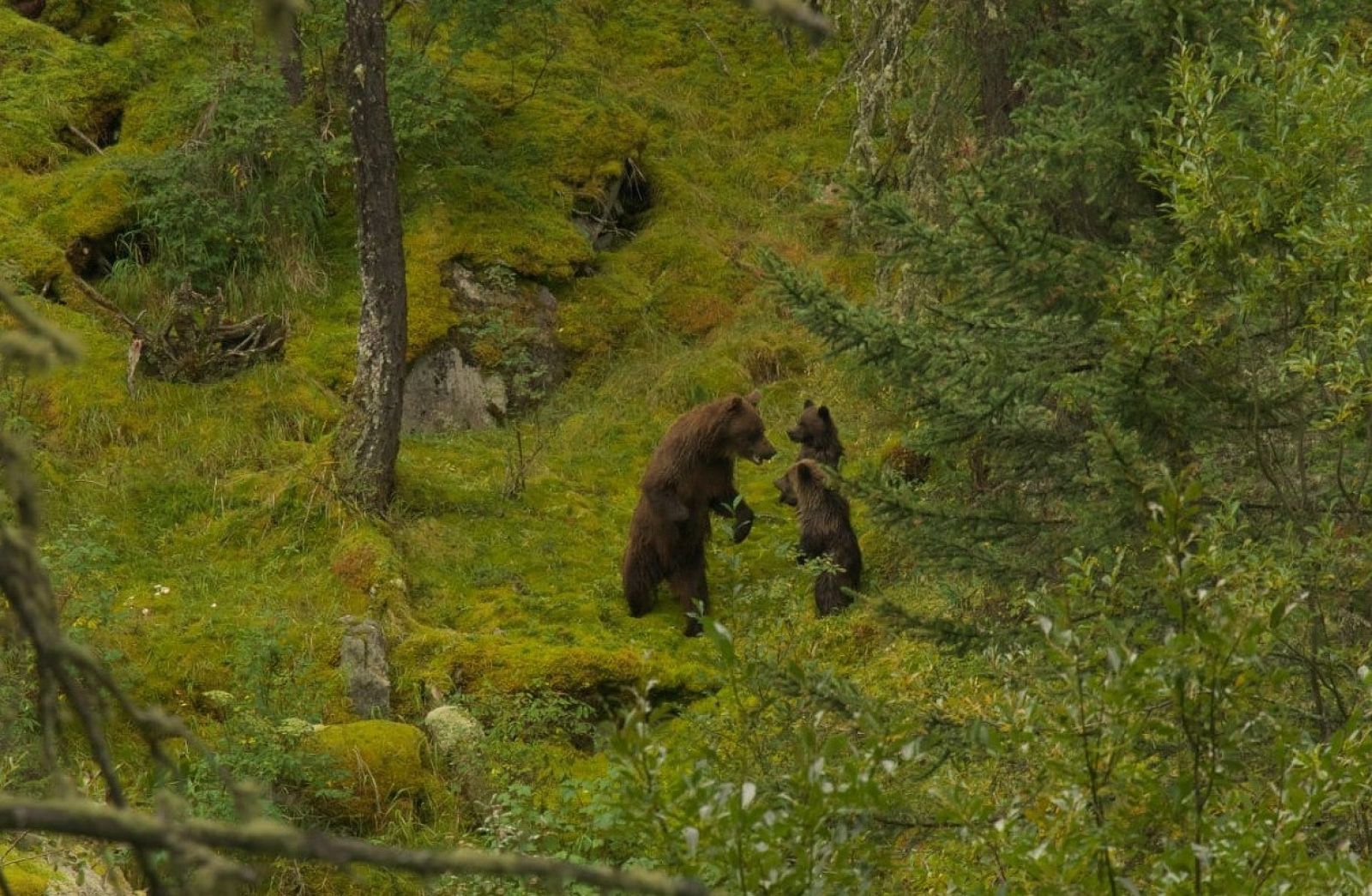 Наблюдение за досугом косолапого семейства из трех медвежат и мамы-медведицы вел начальник Катандинского участка заповедника Иван Заковряшин