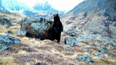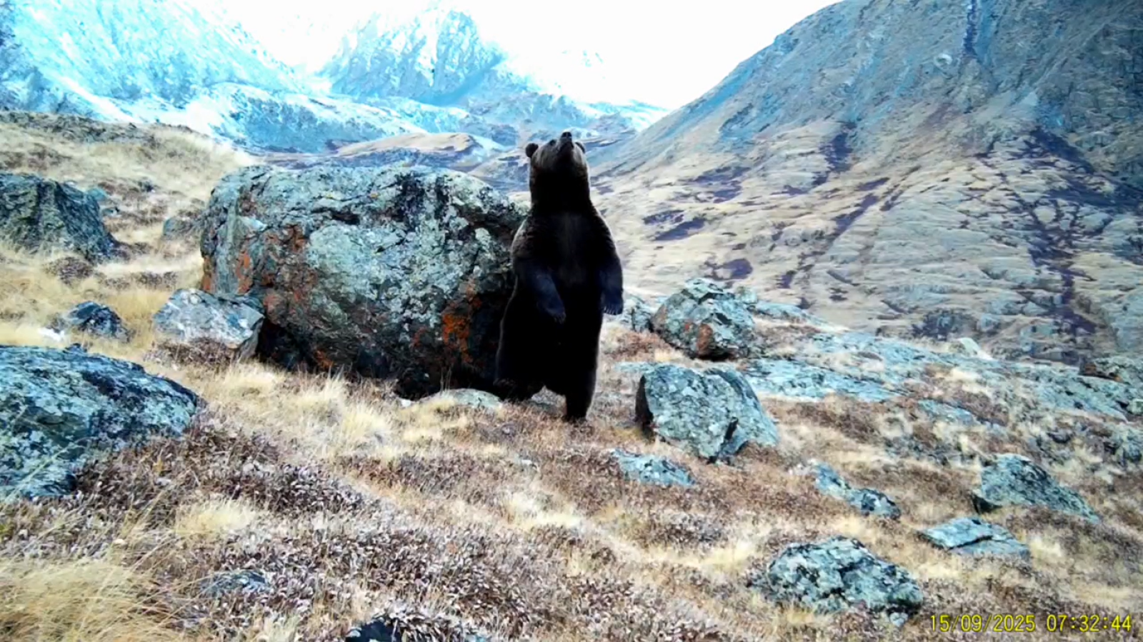 Фотоловушка Сайлюгемского национального парка засняла "танцующего" в горах медведя. Видео поделились в telegram-канале "Друзья снежного барса".