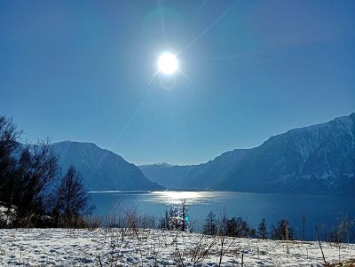 На фотографии запечатлено яркое зимнее солнце над заснеженной Белинской террасой.