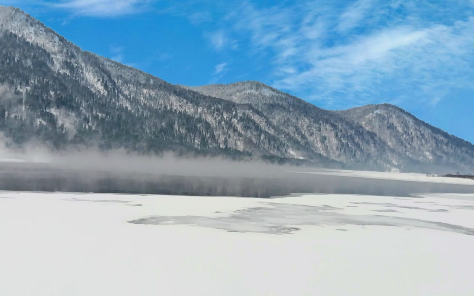 При встрече морозного воздуха с относительно теплой водой озера (+2 градуса) происходит мгновенная конденсация влажного воздуха и рождаются струйки пара.
