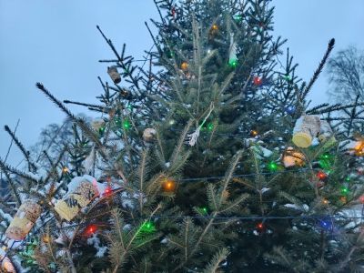 На этот раз учащиеся и педагоги местной школы смастерили особенные украшения-кормушки на уроках труда. Они заморозили в пластиковых стаканчиках залитые водой семечки и зерно, добавили к получившимся "леденцам" экологичную петельку из крапивного жгута и развесили их на елке.