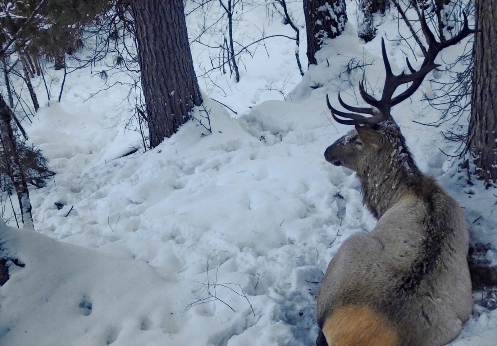 В объектив автоматической камеры попал момент, как марал поднимается после отдыха, чтобы отправиться на поиски корма, который не так-то легко добыть зимой