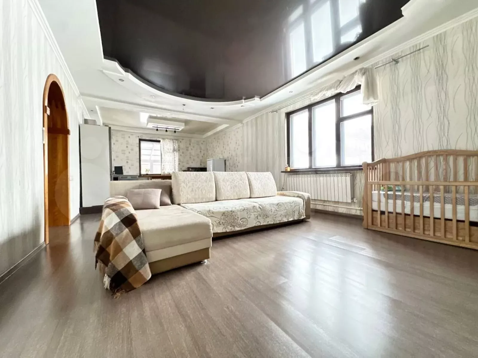 Постройка возведена в 2020 году на ленточном фундаменте. Крыша — из металлочерепицы. Планировка включает просторный зал и кухню на первом этаже, а также три спальни и гардеробную на втором. Санузлы предусмотрены на каждом этаже. На цокольном уровне имеется дополнительно около 100 квадратных метров пространства. Объявление размещено на сайте "Авито".