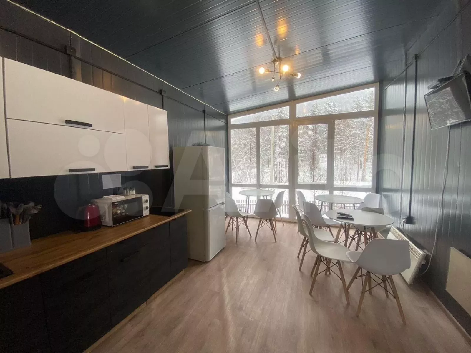 Основной дом из бревна площадью 120 квадратных метров построен на участке площадью 12 соток в 2022 году. Кроме него на территории находятся баня (30 квадратных метров), три небольших гостевых домика по 16 квадратных метров каждый и один дом в стиле A-фрейм площадью 30 квадратных метров с кухней и санузлом. Для гостей оборудована отдельная кухня.