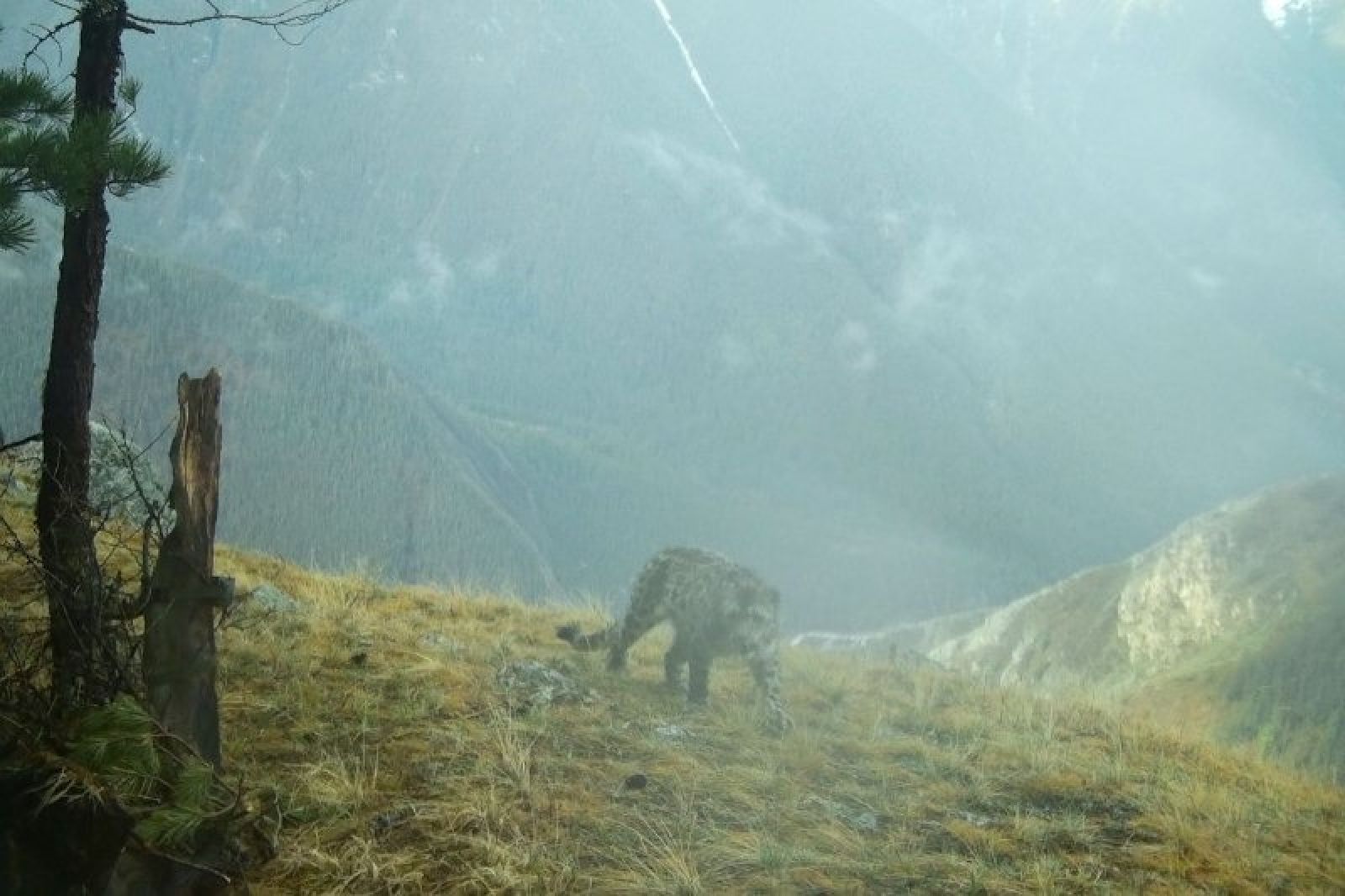 Фотоловушка в Республике Алтай запечатлела промокшего от дождя снежного барса. Кадры опубликовали в telegram-канале Сайлюгемского нацпарка.