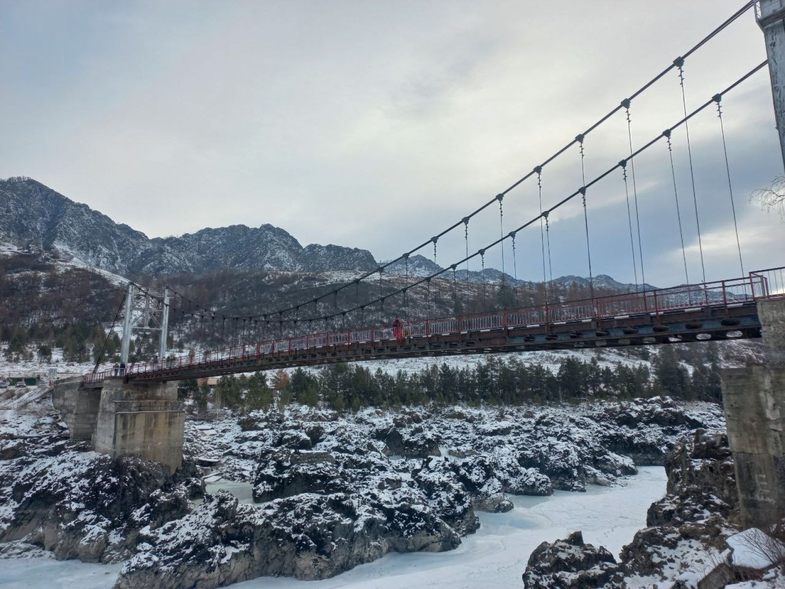 От села Еланда водителям стоит быть внимательнее, так как узкая гравийная дорога местами проходит между скалами и высоким берегом Катуни. Вскоре можно увидеть сам мост – рядом с ним есть автомобильная парковка и торговые павильоны.